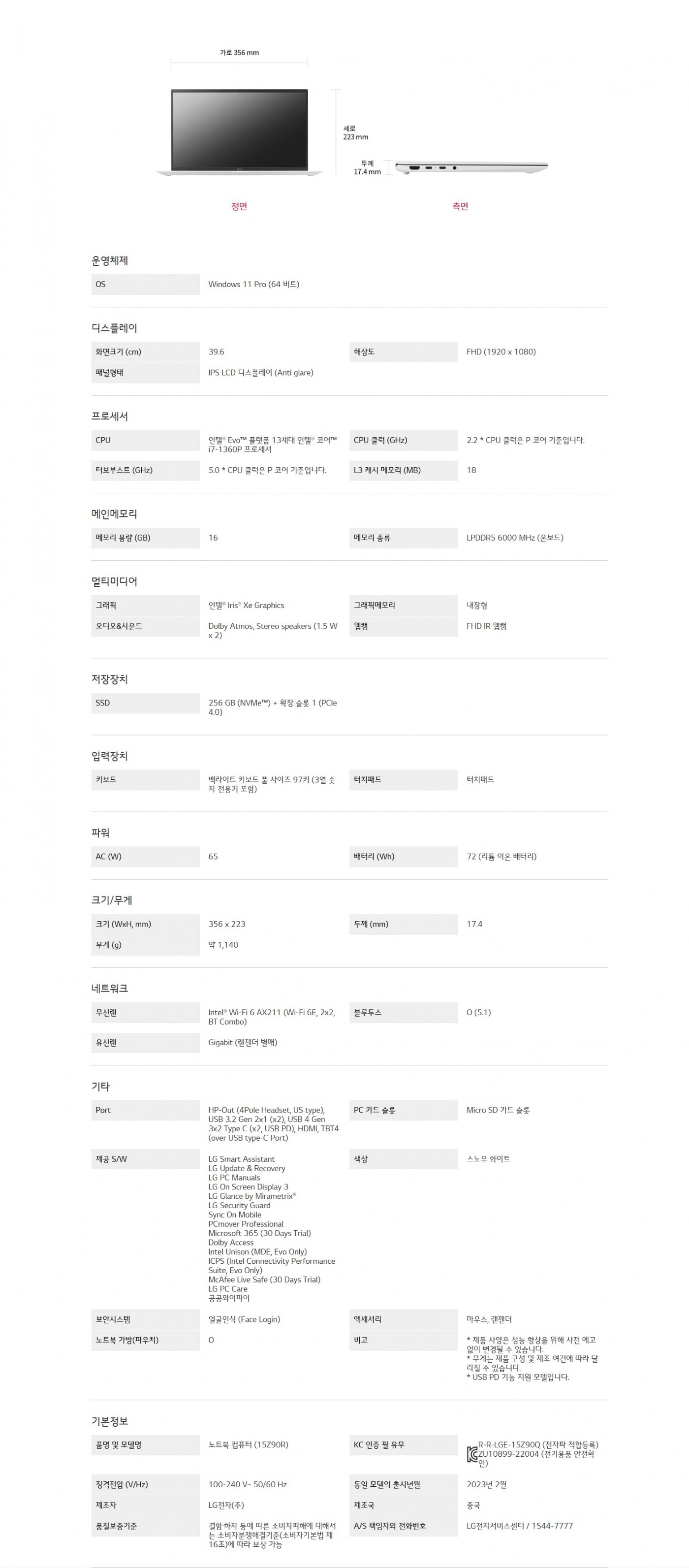 OS:WINDOWS 11 PRO (64 비트) CPU:인텔® EVO™ 플랫폼 13세대 인텔® 코어™ I7-1360P 프로세서 SSD:256 GB (NVME™) + 확장 슬롯