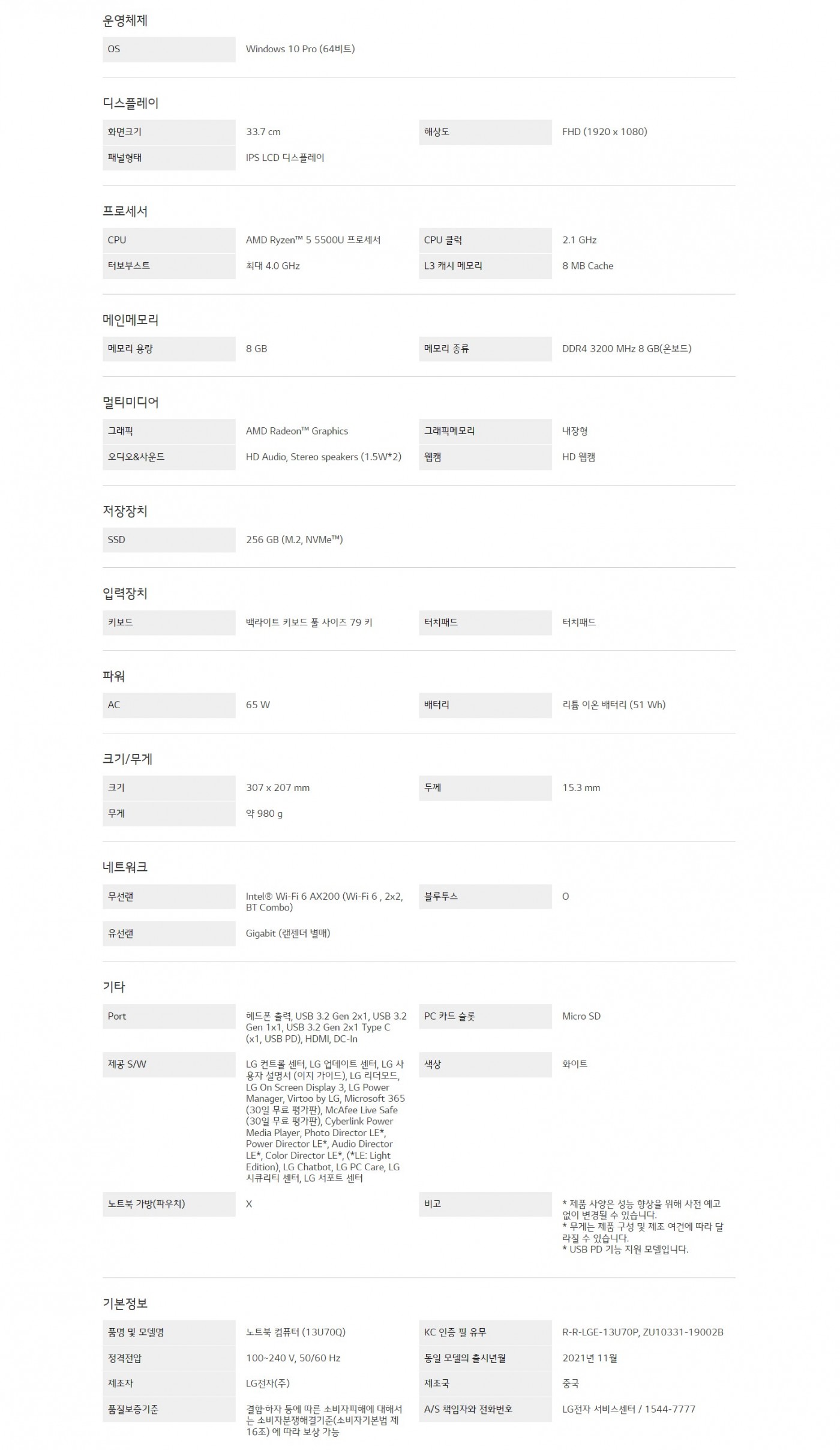 OS : Windows 10 Pro (64비트)CPU : AMD Ryzen™ 5 5500U 프로세서SSD : 256 GB (M.2, NVMe™)