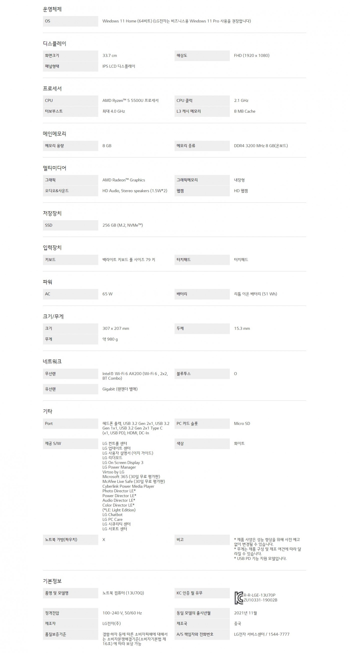 OS : Windows 11 Home (64비트) (LG전자는 비즈니스용 Windows 11 Pro 사용을 권장합니다)CPU : AMD Ryzen™ 5 5500U 프로세서S