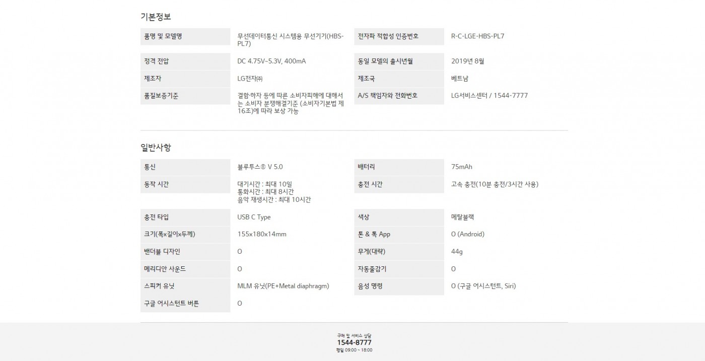 통신 : 블루투스® V 5.0동작 시간 : 대기시간 : 최대 10일통화시간 : 최대 8시간음악 재생시간 : 최대 10시간충전 시간 : 고속 충전(10분 충전/